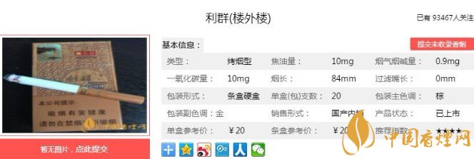 以上便是香煙網(wǎng)小編為大家介紹的關(guān)于利群樓外樓多少錢一包 利群樓外樓價格及口感分析的相關(guān)信息,看完之后大家是不是對于利群(樓外樓)這款香煙的相關(guān)信息更加了解呢。大家還想查詢更多的相關(guān)內(nèi)容歡迎點擊:利群休閑系第一款細支高價煙,僅僅是官方報價就達到了100元一包!