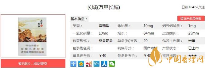 以上便是香煙網(wǎng)小編為大家介紹的關(guān)于長城萬里長城雪茄價(jià)格及口感分析 包裝濃濃的中國風(fēng)的相關(guān)信息,看完之后大家是不是對于長城(萬里長城)這款香煙的相關(guān)信息更加了解呢。大家還想查詢更多的相關(guān)內(nèi)容歡迎點(diǎn)擊:純手工雪茄多少錢 長城傳奇3號價(jià)格1000元一盒
