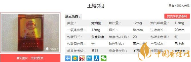土樓(禮)這款香煙蘊藏著“煙魁”等膾炙人口的傳說,味道醇和,有麥芽的香氣!煙絲光澤度高,香氣濃郁豐滿,透發(fā)性好,入口香氣高雅醇厚、細(xì)膩豐滿,吸味甜潤,余味干凈、舒適,回味綿長。綜合來說,這款煙口感還是比較好的!