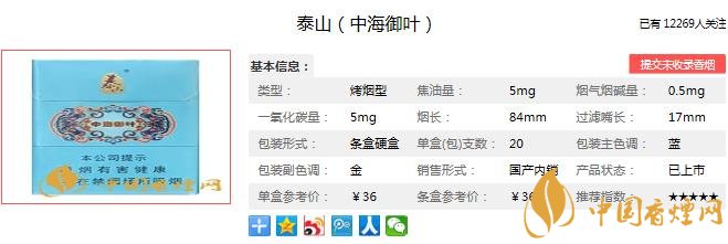 以上便是香煙網小編為大家介紹的關于泰山中海御葉香煙價格及圖片介紹 高性價比的細支低焦香煙的相關信息,看完之后大家是不是對于泰山(中海御葉)這款香煙的相關信息更加了解呢。大家還想查詢更多的相關內容歡迎點擊:泰山香煙價格及圖片 泰山最貴的香煙排行榜