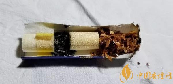 剖開濾嘴,連活性炭段,濾嘴是四段。最外側(cè)是一段中空硬化濾嘴,這個技術(shù)來源于BAT,目前國內(nèi)很多煙廠在其中高端款型上都有采用。從活性炭段前后的絲束段顏色來看,稍稍淺黃,顏色均勻,煙氣的流速和空氣導入效果不錯,活性炭的過濾和穩(wěn)流作用不錯。