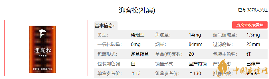 選用享譽(yù)中外的優(yōu)質(zhì)煙葉作為配方主體,產(chǎn)品香氣濃郁,煙氣厚實(shí)自然,口感舒適干凈。產(chǎn)品自然醇化,秉承迎客松產(chǎn)品一貫的優(yōu)良品質(zhì),精心配制,獨(dú)具香韻。即保持了迎客松優(yōu)美的清香風(fēng)格,又賦予成熟煙草的焦甜芬芳,香氣韻味豐富,渾然一體,著重體現(xiàn)優(yōu)雅細(xì)膩、醇和自然、清新宜人的特點(diǎn),口感舒適,回味甘甜,勁頭適中。經(jīng)香煙網(wǎng)小編市場(chǎng)調(diào)查迎客松特貢國(guó)賓售價(jià)為50元/包。