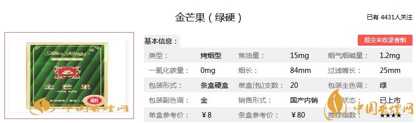 以上就是香煙網(wǎng)小編為大家整理介紹的關于金芒果綠硬多少錢一包?金芒果綠硬香煙價格和圖片的相關內(nèi)容。金芒果香煙曾經(jīng)風靡全國,如今已慢慢淡出市場,實在是可惜啊。想了解更多下個月信息,請關注香煙網(wǎng)!