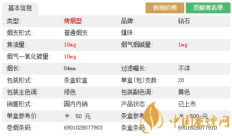 鉆石(軟荷花)采用外溝槽+植物顆粒二元復合嘴棒,外溝槽使得吸附性能更強,截留了煙氣中粒相物,達到更好的過濾效果;采用天然植物多孔材料搭載荷香香味物質的植物顆粒,增加香氣質感、改善吸味、品味舒適。接裝紙采用植絨馬爾斯綠,手感細膩、口感舒適,給人以更好的手感體驗。經香煙網(wǎng)小編市場調查這款煙價格為50元/包。