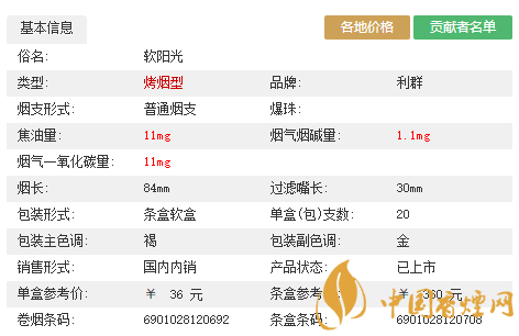 | 利群(西子陽光) | 烤煙型 | 84mm 細支硬 | 310元/條 | 浙江中煙工業(yè)有限責任公司 |