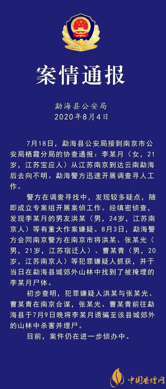 8月4日晚,西雙版納州勐??h公安局發(fā)布通報(bào),經(jīng)調(diào)查尋找,失聯(lián)25天的南京女大學(xué)生月月(化名),已于7月9日晚,被其男友洪某伙同張某光、曹某青,誘騙至勐??h城郊山林殺害并埋尸。