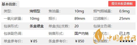 類型 :烤煙型 焦油量 :10mg 煙氣煙堿量 :0.9mg 一氧化碳量 :10mg