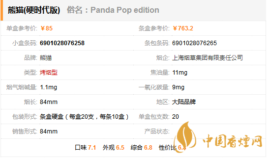 熊貓(硬時(shí)代版)煙(俗稱:Panda Pop edition)是上海煙草集團(tuán)有限責(zé)任公司旗下品牌熊貓香煙推出的一款焦油含量11mg的烤煙型香煙。下面小編就為大家講解一下這款香煙的價(jià)格以及參數(shù)。