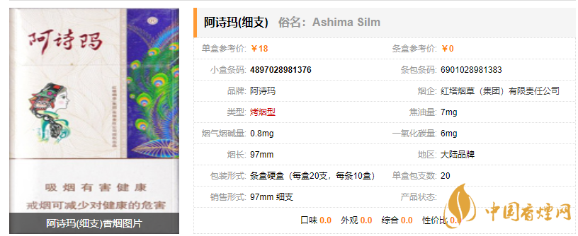 阿詩瑪(細支)香煙價格表圖