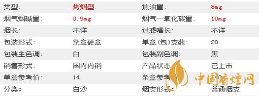 類型 :烤煙型 焦油量 :8mg 煙氣煙堿量 :0.9mg 一氧化碳量 :10mg