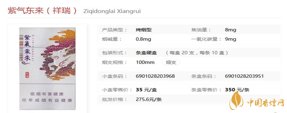紫氣東來祥瑞煙支長100mm,過濾嘴長35mm,定位在細(xì)支煙品類。通過采用低溫保香,多級復(fù)配等特色工藝,使產(chǎn)品煙草本香更加突出,抽吸的均勻性更加穩(wěn)定,使消費(fèi)者在享受煙草香氣的同時(shí),又能體味自然舒適的感覺。下面我們一起來看紫氣東來祥瑞的參數(shù)信息:焦油量:8mg煙堿量:0.8mg一氧化碳量:9mg。