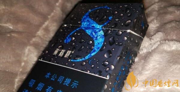 這款香煙正面外觀來看給人的第一印象它就是一款涼煙,炫酷純黑的底色搭配晶亮水滴為主色調,同時冰藍顏色的抽象冰塊圖案形成了一個數字“8”形狀,讓人覺得涼爽的同時也突出了產品LOGO。