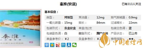 秦淮香煙系江蘇中煙出品,烤煙型香煙,由于種種原因,現(xiàn)如今這個(gè)品牌的香煙已經(jīng)退出市場(chǎng)了,先如今留給后人的只有懷念,這也是中國(guó)煙草市場(chǎng)不變的定律,那么在對(duì)秦淮香煙價(jià)格表進(jìn)行介紹之前,先來看一看這款秦淮煙多少錢一包,這款秦淮(軟藍(lán))的售價(jià)為2元/包。