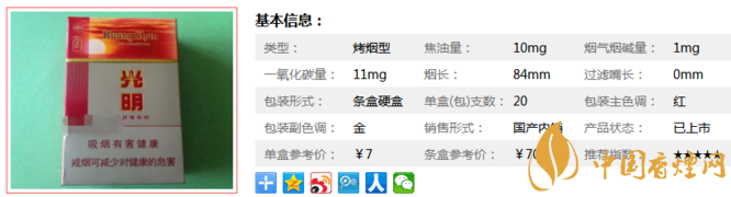 光明香煙是合肥的香煙品牌,“光明”卷煙是合肥卷煙廠60年代老品牌,當(dāng)時(shí)被譽(yù)為“大火把”,現(xiàn)已整合進(jìn)“黃山”品牌。是一款經(jīng)典又好抽的香煙,下面就由香煙網(wǎng)小編帶大家來(lái)了解一下光明香煙的相關(guān)參數(shù)信息。
