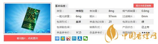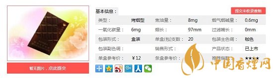 | 類(lèi)型 :烤煙型 | 焦油量 :8mg | 煙氣煙堿量 :0.6mg | 一氧化碳量 :6mg |