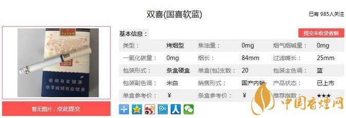 雙喜國喜軟藍(lán)煙支長84mm,過濾嘴長:25mm,因?yàn)檫@款是“非賣品”,所以全部為“0”的理化指標(biāo),當(dāng)然這不可能是“0”焦油的,是廠家沒有標(biāo)注具體的理化指標(biāo)而已。
