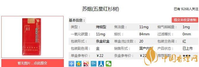 蘇煙五星紅杉樹產(chǎn)品包裝大膽采用全版電化鋁印刷技術(shù)及橫向的純字體裝飾,外觀設(shè)計簡約大方、時代感強,喜慶、大方,與“蘇煙”系列產(chǎn)品風格一脈相。經(jīng)香煙網(wǎng)小編市場調(diào)查蘇煙五星紅杉樹售價為22元/包。