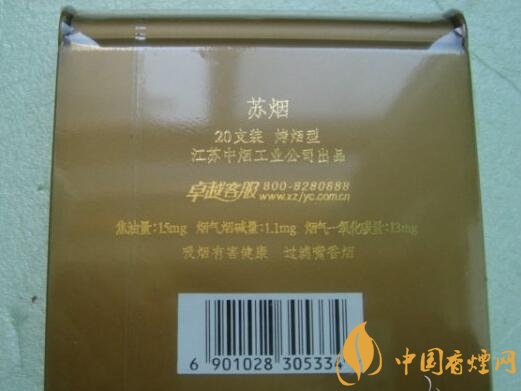 暗金色塑盒包裝,主體為方形,上下兩側(cè)作弧形處理,給人以輕巧圓潤(rùn)之感。正面左側(cè)一道極似女人身體曲線的“S”形劃過,旁邊有繁寫的“蘇煙”二字,右下方是“江蘇中煙工業(yè)公司出品”,設(shè)計(jì)簡(jiǎn)約,表意婉約。背面標(biāo)有商品的基本信息(包括三項(xiàng)理化指標(biāo)、條形碼等)和警示語(yǔ)。其余四面皆無(wú)文字或圖案。
