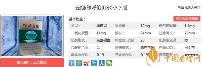 “呼倫貝爾”是烏蘭浩特卷煙廠生產(chǎn)的頂尖品牌,烏蘭浩特卷煙廠是紅云紅河集團在省外生產(chǎn)卷煙的兩大卷煙生產(chǎn)廠之一。小字版云煙綠呼倫貝爾除了焦油含量比大字版本初期云煙綠呼高出1毫克之外,煙堿和一氧化碳的數(shù)值含量,兩代版本是相同的。經(jīng)香煙網(wǎng)小編市場調(diào)查云煙綠呼倫貝爾小字版售價為19元/包。
