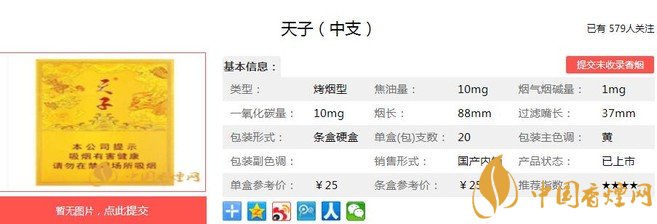 天子中支煙支長88mm,過濾嘴長37mm,選用優(yōu)質(zhì)進口凹槽嘴棒,采用濾嘴通風技術(shù),有效降低了煙氣中有害物質(zhì)的含量,順應了目前降焦減害的發(fā)展方向。下面我們一起來看天子中支的參數(shù)信息:焦油量:10mg 煙堿量:1.0mg 一氧化碳量:10mg