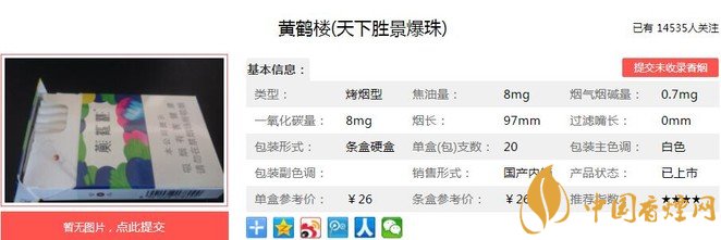 黃鶴樓天下勝景爆珠煙支長97mm,運(yùn)用中國獨(dú)有的木桶薰蒸技術(shù),形成了煙草本香與生姜植物的有機(jī)結(jié)合。下面我們一起來看黃鶴樓天下勝景爆珠的參數(shù)信息:焦油量:8mg 煙堿量:0.7mg 一氧化碳量:8mg