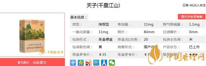 天子(千里江山)選用重慶武陵地區(qū)優(yōu)質(zhì)煙葉為原料,使用了四大減害技術(shù),聞起來(lái)有一股淡淡的梅香。經(jīng)香煙網(wǎng)小編市場(chǎng)調(diào)查天子(千里江山)售價(jià)為35元/包。
