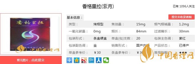 香格里拉紫月用料考究,加工精細品質(zhì)出眾,是昆煙繼云煙珍品之后推出的又一高品質(zhì)產(chǎn)品。這款煙包裝漂亮,煙氣醇厚、本香十足,給力的15焦給人較強的滿足感,但煙氣的順滑度較差,入口有辣感,目前已經(jīng)停產(chǎn)下市。經(jīng)香煙網(wǎng)小編市場調(diào)查香格里拉紫月售價為30元/包。