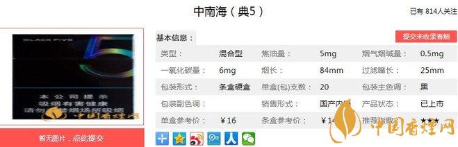 整體設(shè)計大面積黑色留空,靈動絢麗的數(shù)字“5”設(shè)計,給大面積的黑色注入活力,避免色彩的單調(diào),以極簡的方式,給人以更多的想象空間。其煙氣柔和細膩,香氣飽滿,余味干凈,且混合型特點更加突出。經(jīng)香煙網(wǎng)小編市場調(diào)查中南海典5售價為16元/包。