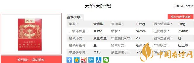 臺(tái)灣制造,取材自然,配方考究,工藝精湛,原料甄選自南緯23° 以北和北緯23°以南世界級優(yōu)質(zhì)名產(chǎn)區(qū)出產(chǎn)的優(yōu)質(zhì)烤煙煙葉,煙氣醇和飽滿,煙香細(xì)膩豐富,口感純正,三香合一。經(jīng)香煙網(wǎng)小編市場調(diào)查大華大時(shí)代售價(jià)為16元/包。