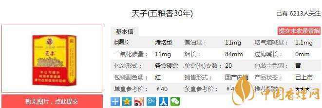 天子五糧香30年包裝盒正中間是稻谷、小麥、玉米、高粱、大豆的圖案,也就是所謂的內(nèi)含五糧香珠的“五糧”,香煙吸味上純粹五糧香,口感甘甜、味道醇厚,深受廣大煙民的喜歡。經(jīng)香煙網(wǎng)小編市場(chǎng)調(diào)查天子五糧香30年售價(jià)為40元/包。