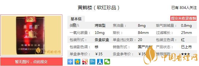 黃鶴樓的煙大部分還是很有名氣的,什么1916、峽谷柔情、雅韻這些系列大家口熟能祥。黃鶴樓的煙在煙民中口碑還是不錯的。作為樓煙“珍品”系列,黃鶴樓(軟紅珍品)可以在黃鶴樓眾多香煙中被冠以珍品之名,可見也是不俗。下面香煙網(wǎng)小編就給大家介紹下黃鶴樓(軟紅珍品)的參數(shù)和口感。
