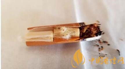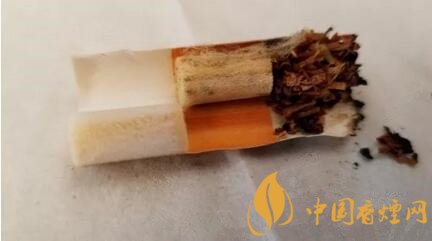 剖開濾嘴,為兩段式濾嘴。濾嘴絲束的總長恰好到水松紙那圈回字紋之處。降焦孔開在了兩段濾嘴絲束的交界處。前段絲束間雜有細(xì)小的棕黃色顆粒。這是云煙新的濾嘴技術(shù),顆粒物為云南地產(chǎn)古樹普洱茶萃取物。