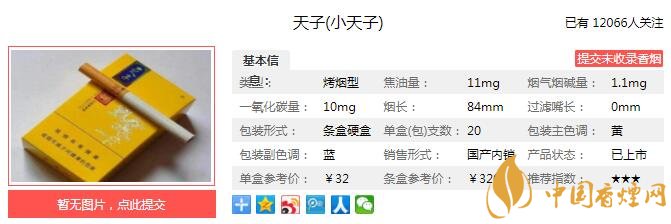 類型 :烤煙型 焦油量 :11mg 煙氣煙堿量 :1.1mg 一氧化碳量 :10mg