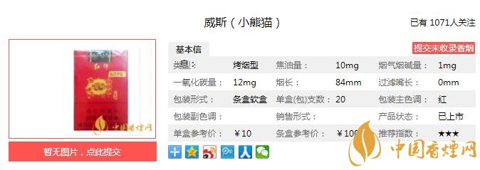 威斯小熊貓的前身是紅河小熊貓世紀(jì)風(fēng),紅河小熊貓世紀(jì)風(fēng)的前身是小熊貓軟紅世紀(jì)風(fēng)。品牌是一變?cè)僮儯藲鈪s一降再降,現(xiàn)在也是風(fēng)光不在了。經(jīng)香煙網(wǎng)小編市場(chǎng)調(diào)查威斯小熊貓售價(jià)為10元/包。