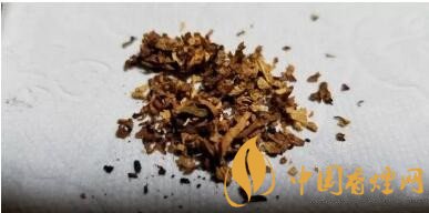 攤開煙絲,明黃的烤煙和暗棕的晾煙比例基本接近1:1。有切得很細(xì)碎的煙梗交雜其間。烤煙比例比摩洛哥版本要略高一些。