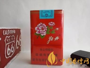 煙嘴顏色是黃色,上面隱約可以看到一些白色的小點(diǎn),煙支上面印有牡丹的圖案和logo。