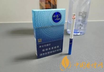 看包裝,煙盒的正面通體以藍色為主色調(diào),整體的色彩仍然維持著“利群”系經(jīng)典的三段式設(shè)計,顏色從上至下逐漸加深。上段為小翻蓋,在小翻蓋的右側(cè)是一個直徑約為18MM的圓形標(biāo)志,圓形標(biāo)志的主色調(diào)為寶藍色,里面是利群的漢字和漢語拼音,圓形的輪廓和字體的顏色為金色。