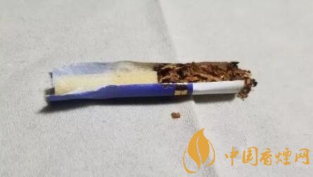 剖開濾嘴,絲束長度并不長,14mm左右。降焦孔正好在絲束的中部位置。水松紙內(nèi)部還襯有一層類似綿紙的細軟質(zhì)層。絲束的顏色比較淺,前段稍稍變黃一些。整段顏色均勻。