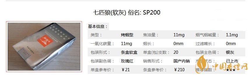 七匹狼軟灰亦稱七匹狼(SP200),精選國內(nèi)外優(yōu)質(zhì)烤煙,人工片選精華,運(yùn)用國際先進(jìn)的無氟及過濾技術(shù)、HXD烘絲工藝,由全新的國際一流廠房和設(shè)備精工制作,氣質(zhì)卓越優(yōu)雅,品味自然純正,煙草本香流露無遺,是比較經(jīng)典的具有較高性價比的狼煙。經(jīng)香煙網(wǎng)小編市場調(diào)查七匹狼軟灰售價為21元/包。