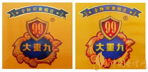 假冒卷煙:1.該款假冒卷煙盾牌、大重九字體、花團圖案等商標未做凹凸處理。2.大重九字體筆畫粘連,藍色底紋顏色偏差較大。如圖左真右假