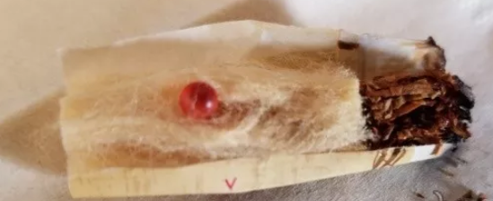 點燃一支,正常抽吸兩口之后,捏破爆珠。靜候2、3秒,讓爆珠成分浸潤絲束,再抽吸時,吸阻略微降低了一些。據說爆珠萃取自香格里拉所產的雪山苷草,捏爆后煙氣自然甜潤,增添煙氣的層次感。剖開濾嘴,是整段式的醋酸纖維絲束,濾嘴沒有降焦孔,絲束的顏色淡黃,顏色變化從煙絲端到吸入端,均勻變化、色差很小。這個根據賞玩品吸時的感受,這樣的濾嘴結構在吸阻偏大的同時并沒有影響到煙氣的質量,就比較難得了。