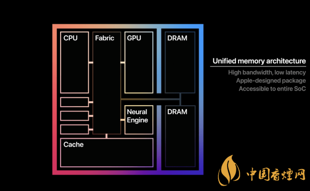 它與iPhone和iPad里面的蘋果芯片非常相似,只是功能更強大。它利用了蘋果公司的統(tǒng)一內(nèi)存架構(gòu)(UMA),這意味著全部內(nèi)存(DRAM)與需要訪問內(nèi)存的各種部件(比方說CPU、GPU、圖像處理器以及神經(jīng)引擎)都是在同一塊芯片上。其結(jié)果是,整塊芯片都可以訪問數(shù)據(jù),而不需要在不同部件之間復(fù)制數(shù)據(jù),也不需要進(jìn)行互連。對內(nèi)存的訪問有著極低的時延與極高的帶寬。其結(jié)果是更低功耗、更好性能。