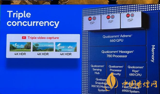 驍龍888移動平臺內(nèi)封裝全新的Qualcomm Spectra 580 ISP,也就是圖像信號處理模塊,該模塊實際上共有三個ISP(上代是兩個),能夠以每秒處理27億像素的速度,支持三個攝像頭的并發(fā)拍攝。