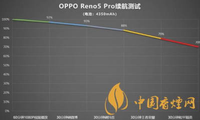 根據(jù)測試結(jié)果顯示,使用OPPO Reno5 Pro觀看60分鐘1080P視頻僅耗電3%、刷30分鐘微博僅耗電4%、刷30分鐘抖音僅耗電5%、玩30分鐘《王者榮耀》僅耗電9%、玩30分鐘《和平精英》僅耗電9%,在高強度使用3小時后,OPPO Reno5 Pro共計耗電30%,剩余電量還有70%。