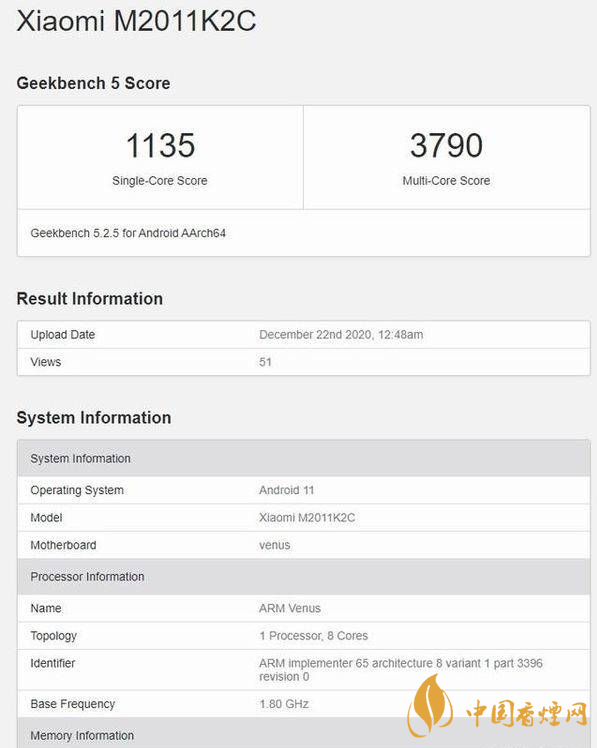 在小米官方宣布完小米11的發(fā)布時間之后,有博主對小米11再次開啟了新一輪的細節(jié)爆料。數(shù)據(jù)顯示,小米11主頻可達 1804 MHz,擁有12GB運存,運行安卓 11,跑分的最高一次成績是 1135 的單核得分以及多核 3790 的多核得分。