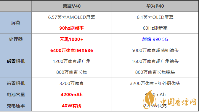 榮耀v40:搭載了天璣1000+,天璣1000+采用了7nm工藝制程,四個2.6GHz的A77大核和四個2.0GHz的A55小核,支持2G/3G/4G/5G多制式,支持 5G 雙載波聚合(2CC CA),支持Sub-6GHz頻段,支持4.7Gbps的下行速度
