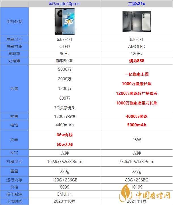 三星s21ultra和華為mate40pro+作為近期新發(fā)手機中的佼佼者,那么這兩款手機的區(qū)別是什么?哪款手機更值得入手?接下來香煙網(wǎng)小編為大家?guī)碜钚碌娜莝21ultra和華為mate40pro+參數(shù)對比,快來看看吧。