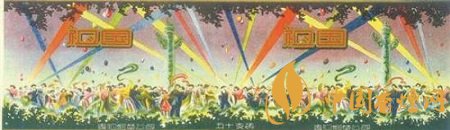 最為獨(dú)特的團(tuán)結(jié)主題煙標(biāo)莫過(guò)于貴陽(yáng)煙草公司出品的“祖國(guó)”煙標(biāo)。這枚出品于上世紀(jì)50年代的煙標(biāo),以橫長(zhǎng)的寬幅全景畫(huà)面,描繪了在彩色射燈的襯托下,我國(guó)各族人民歡聚于華表周?chē)M情舞蹈的宏大場(chǎng)面。