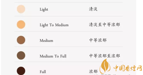 雪茄濃度,是指一支雪茄味道的濃郁程度。在哈伯納斯的官網(wǎng)上對(duì)幾個(gè)主要的雪茄品牌的濃郁程度都有標(biāo)示。一般來說,雪茄的濃郁程度,可以劃分為以上5個(gè)檔次: