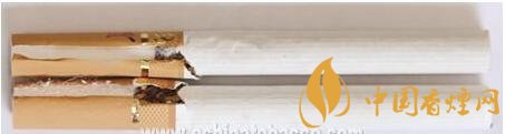 真煙煙支采用單一醋纖濾嘴,長度為25mm,煙絲切絲寬度均勻,煙絲疏松、光澤油潤性好、呈檸檬黃色、含碎末少,煙絲結(jié)構為葉絲、膨脹葉絲、膨脹梗絲和再造煙葉;假煙煙支過濾嘴較短,長度約為20mm,制絲工藝粗糙,色澤發(fā)暗無光澤、呈青褐色、煙絲中含碎末較多,大量梗絲未經(jīng)過膨脹處理,一般無膨脹葉絲和再造煙葉,與真品特征存在明顯差異。